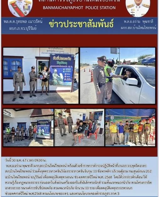 อ.บ้านใหม่ไชยพจน์ จ.บุรีรัมย์ เพื่อลดอุบัติเหตุทางถนน ช่วงเทศกาลปีใหม่ พ.ศ. 2568 โดยได้ว่ากล่าวตักเตือน ให้ความรู้เรื่องกฎหมายจราจร ก่อนออกใบสั่งผ่านเครื่องออกใบสั่งอิเล็กทรอนิกส์ รวมทั้งแจกหมวกนิรภัย ตามโครงการจิตอาสาจราจร รณรงค์การขับขี่ปลอดภัย สวมหมวกนิรภัย จำนวน 10 ราย เพื่อลดอุบัติเหตุจราจรทางบก